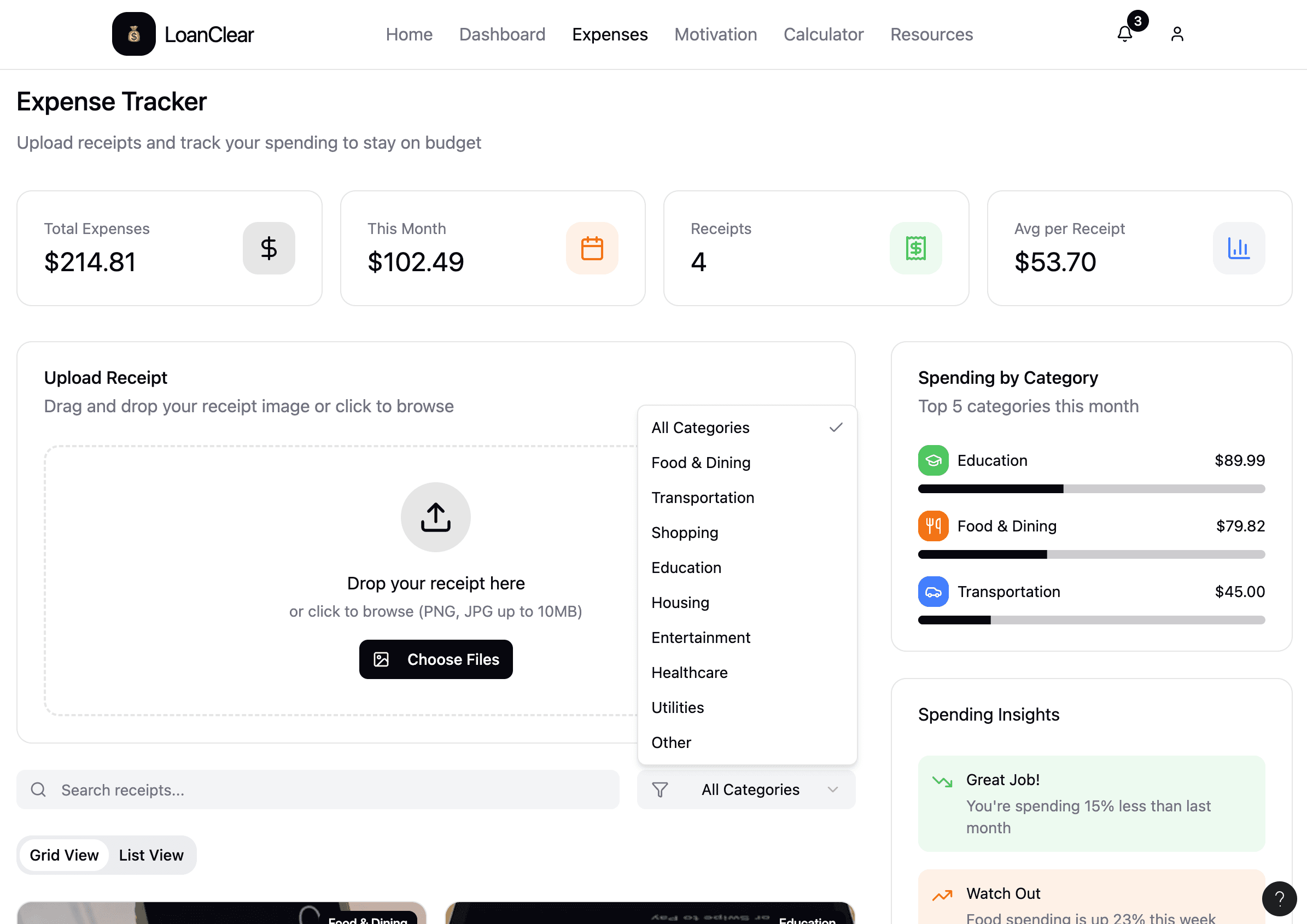 Designed to help users stay accountable and in control, the Expense Tracker lets students upload receipts, categorize spending, and view insights that connect everyday expenses to their loan goals.