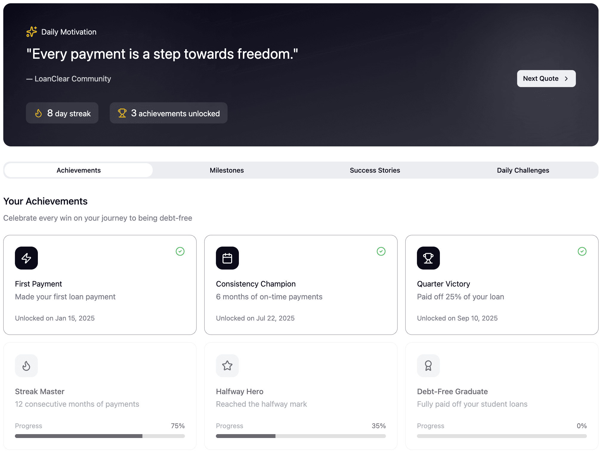 The Motivation Hub keeps users emotionally engaged through daily quotes, achievements, and milestone progress, turning loan repayment into a rewarding and empowering journey.