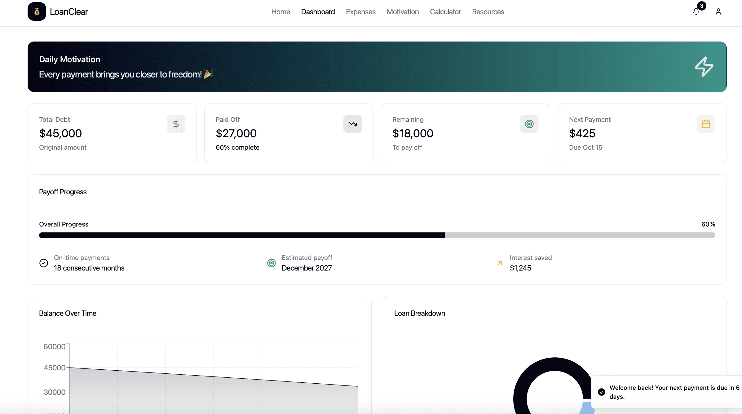 Provides a clear snapshot of total debt, progress, and upcoming payments, helping users stay organized and confident in their repayment journey.