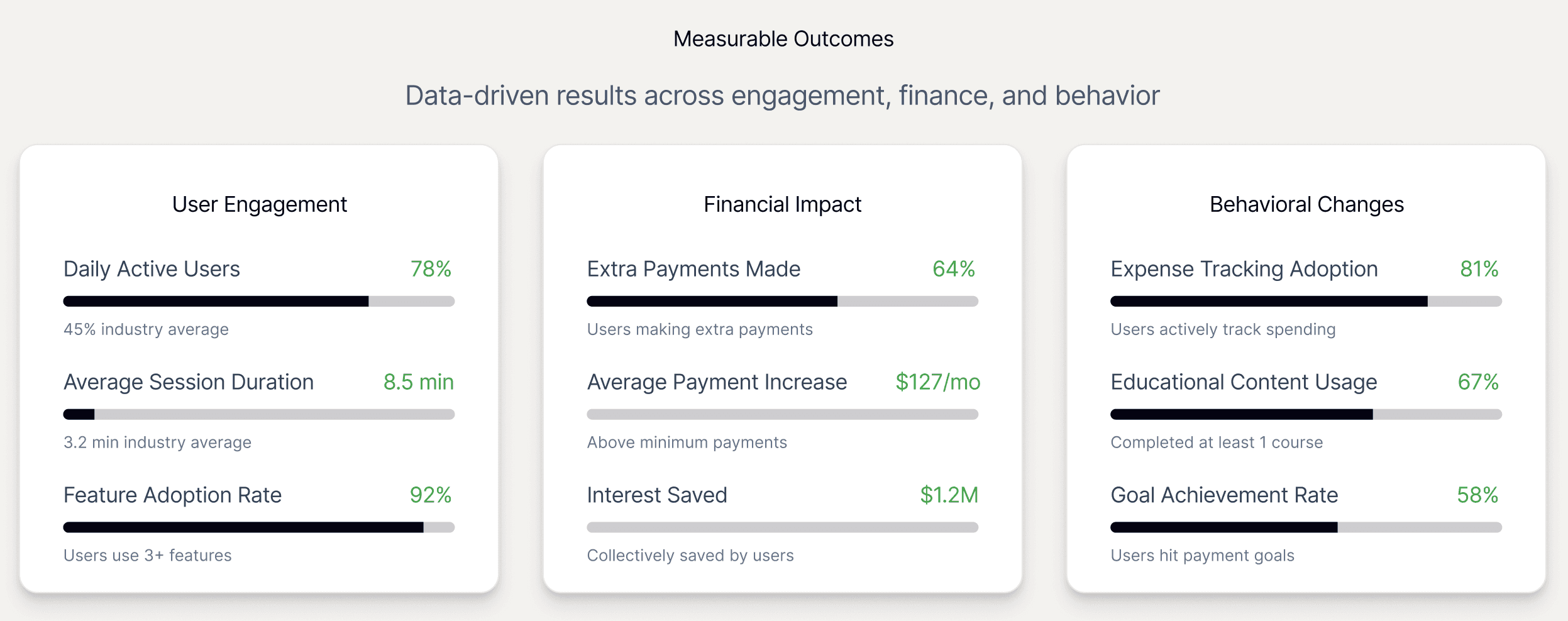 Users reported feeling less stressed and more confident in their repayment plans. They also found the app’s motivational features and progress visuals helped them stay consistent and build healthier financial habits.