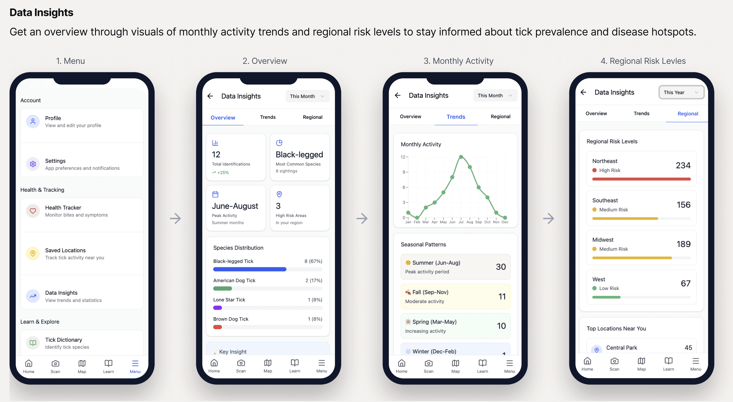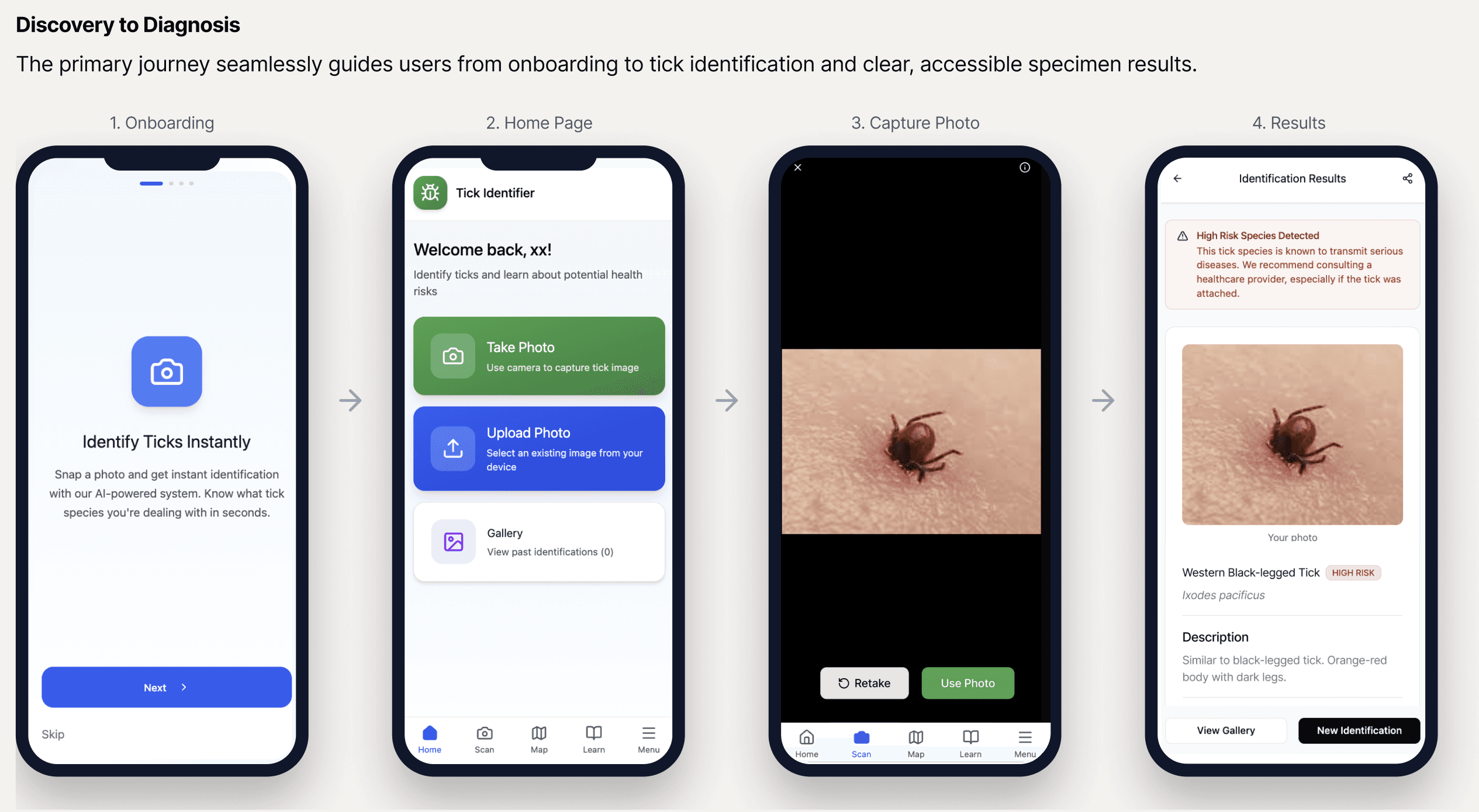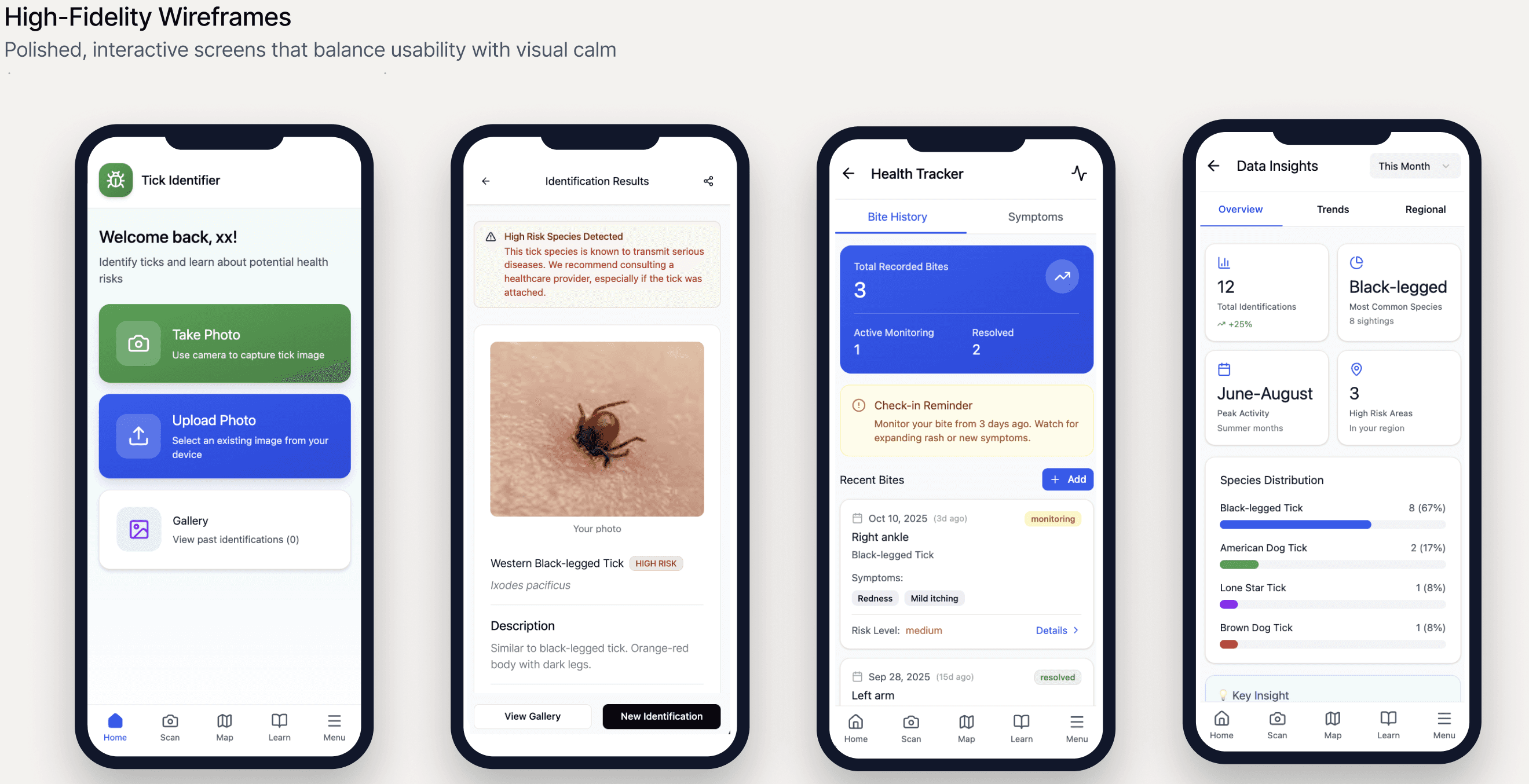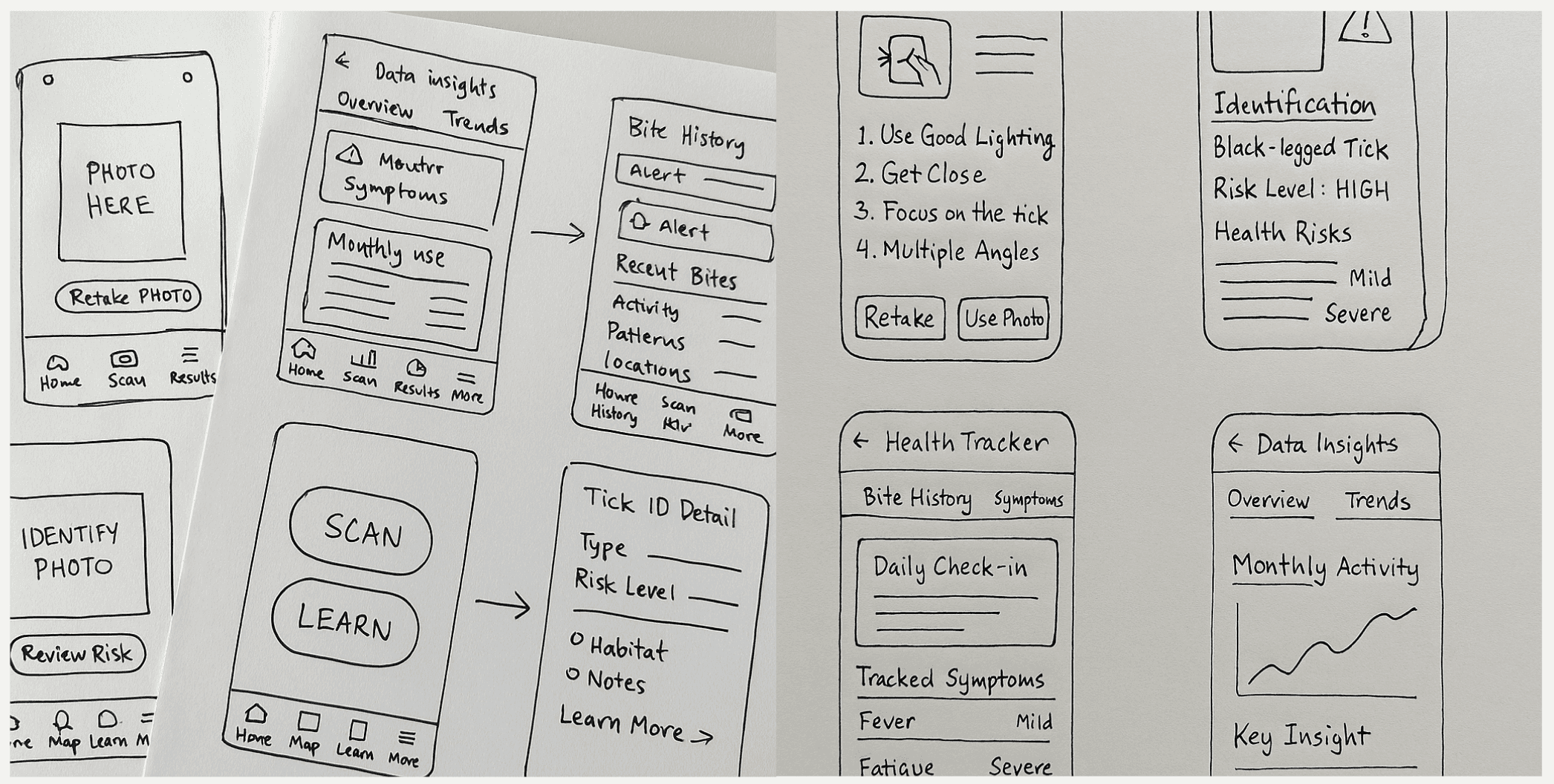 I began by mapping the core user journeys - the structure prioritized quick access to critical tools (like tick ID, symptom checker, and bite log) while ensuring secondary features supported user confidence and learning.
