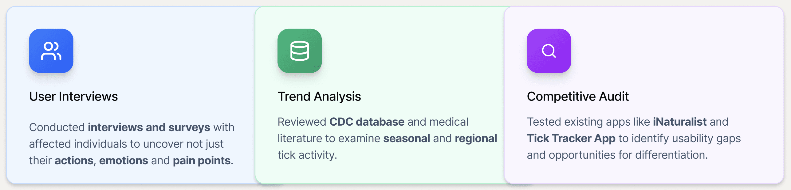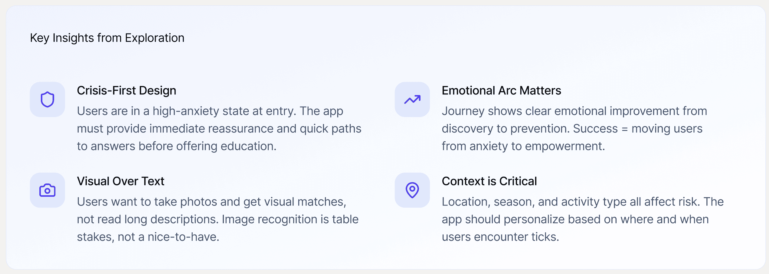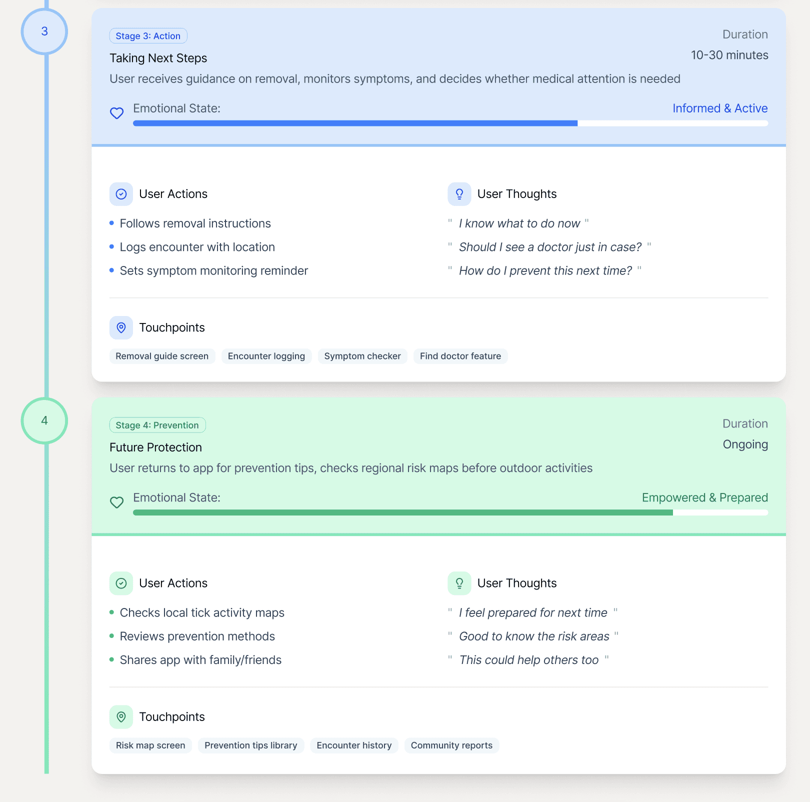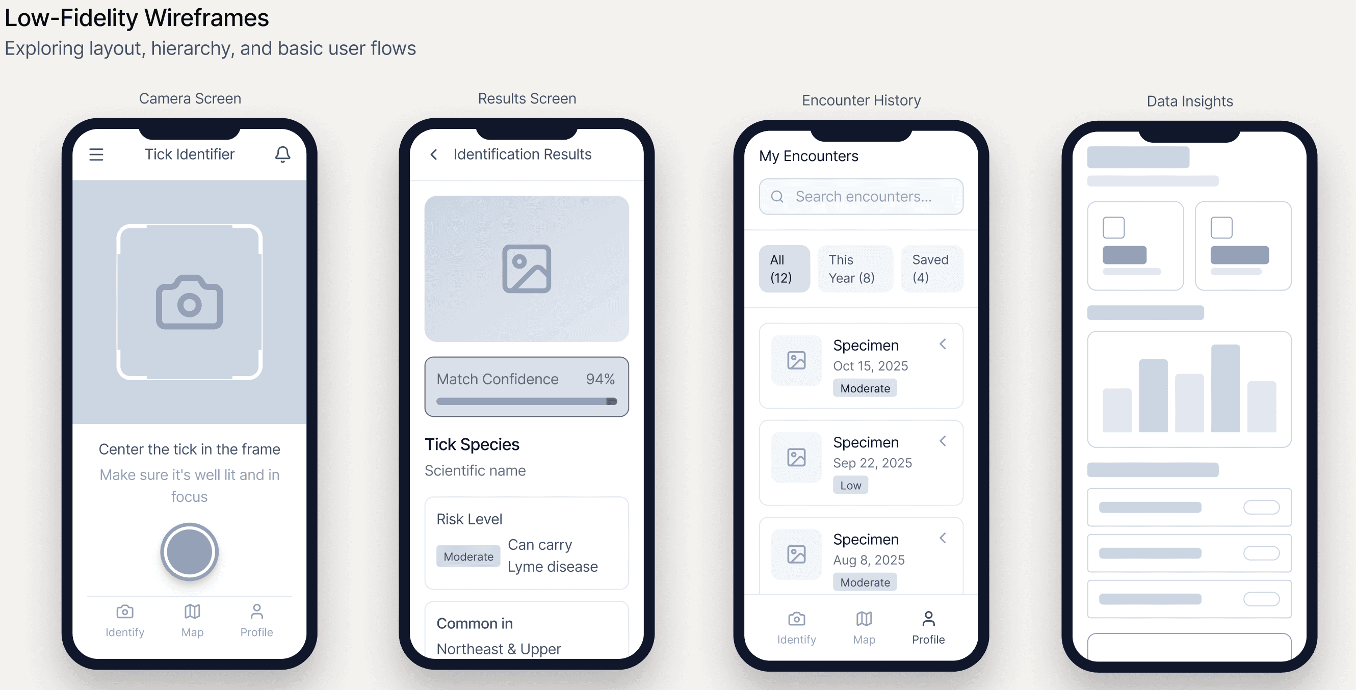 I began by mapping the core user journeys - the structure prioritized quick access to critical tools (like tick ID, symptom checker, and bite log) while ensuring secondary features supported user confidence and learning.