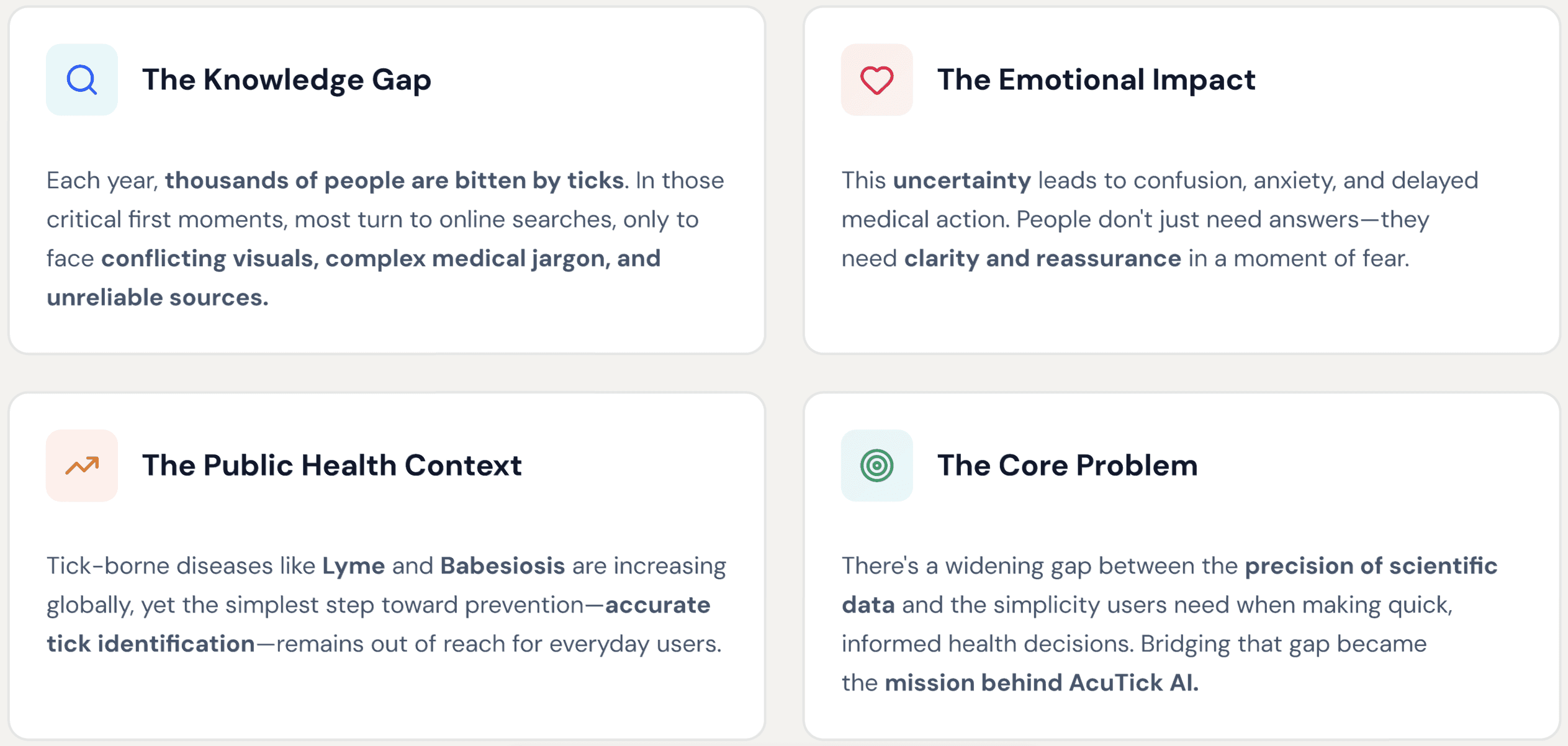 When a tick bite happens, uncertainty can be scary. Most people don’t know which tick bit them, what diseases it might carry, or what steps to take next. That’s where AcuTick AI comes in — a human-centered app designed to turn complex science into reassurance. |